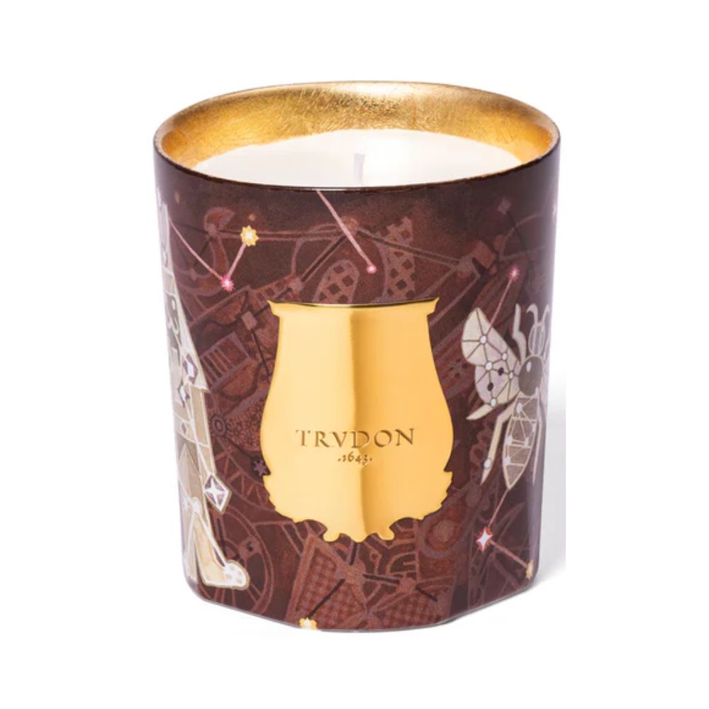 Trudon illuminates the heavens with constellations gilded in warm gold - a celebration of art, scent, and celestial wonder. Under this starlit canopy, illustrator Brecht Evens sketches dreamlike constellations that Trudon transforms into radiant objects of light. Within this luminous constellation shines Libra, a woody amber creation balancing warmth and harmony.