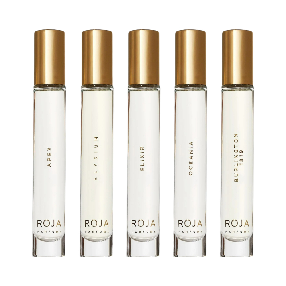 Includes: 5 X 10ml EDP (Apex, Elysium Parfum Cologne, Elixir, Oceania, 1819). Discover The Travel Collection by Roja Parfums. Explore some of the most iconic Roja Parfums creations with this luxury travel set â perfect for the perfume-loving globe-trotter. These 10ml travel sprays enable you to take any of our five iconic creations with you wherever you roam. Whether venturing through the tropical jungle of Apex or relaxing on a remote island with Oceania, the Travel Collection will transport you on a sensory voyage like no other. Inlcudes: Apex Elysium Elixir Oceania Burlington 1819